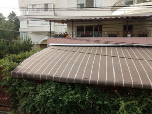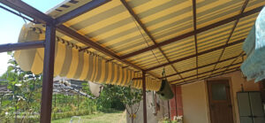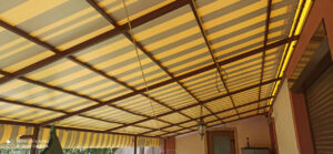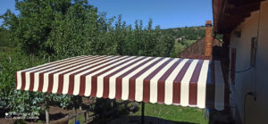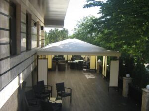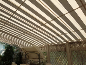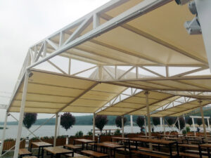 Навесы — это недорогие и надежные металлоконструкции, которые идеально подходят для террас. В качестве покрытия мы используем прочную тентовую ПВХ-ткань или специальную акриловую ткань ORCHESTRA MAX. Возможно комбинировать материалы: например, крыша из ПВХ, а рюшка по периметру — из однотонной или полосатой акриловой ткани. Это выглядит красиво и функционально. Также в ассортименте есть новинка — полосатые ПВХ-ткани от нашего поставщика SIOEN.